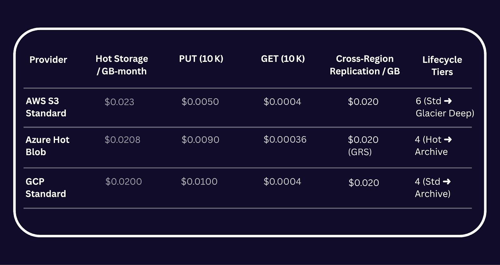 While Azure and GCP undercut AWS on raw GB, note the 2× higher PUT charge at Azure and double PUT at GCP. For workloads writing billions of small files (IoT telemetry, CDN logs), AWS can end up cheaper overall.