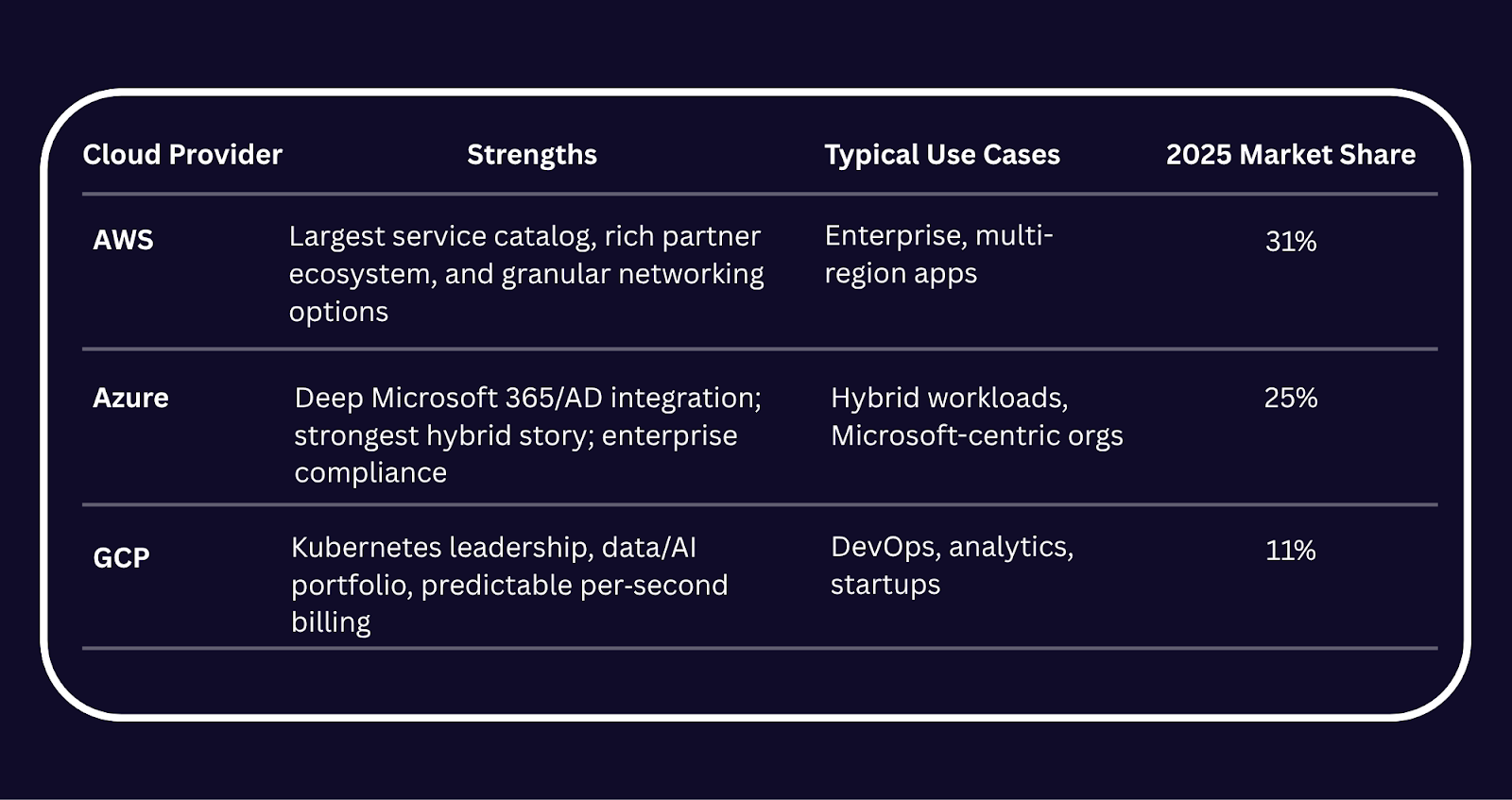 Before we start discussing pricing, let’s understand the positioning of each provider. Each cloud platform brings unique advantages that go beyond cost alone. When you examine their strengths and primary areas of adoption, you can better evaluate which provider aligns with your current and future infrastructure goals.