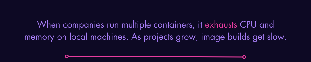 When companies run multiple containers, it exhausts CPU and memory on local machines. As projects grow, image builds get slow. Unused images and volumes fill up storage. Container image downloads and updates become limited because of network bandwidth.