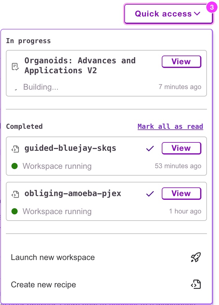 - Notification Drawer: We've added a notification drawer to keep you informed when a job (e.g., recipe build, workspace launch) is complete, allowing you to navigate the site without waiting for processes to finish.