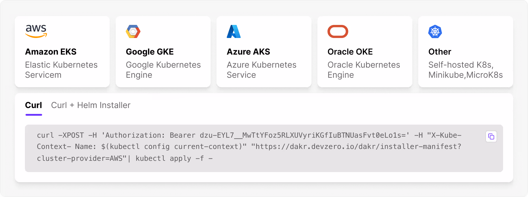 DevZero supports Amazon Elastic Kubernetes Service (EKS), Google Kubernetes Engine (GKE), Azure Kubernetes Service (AKS), Oracle’s cloud platform (OCI), as well as on-prem Kubernetes implementations.
